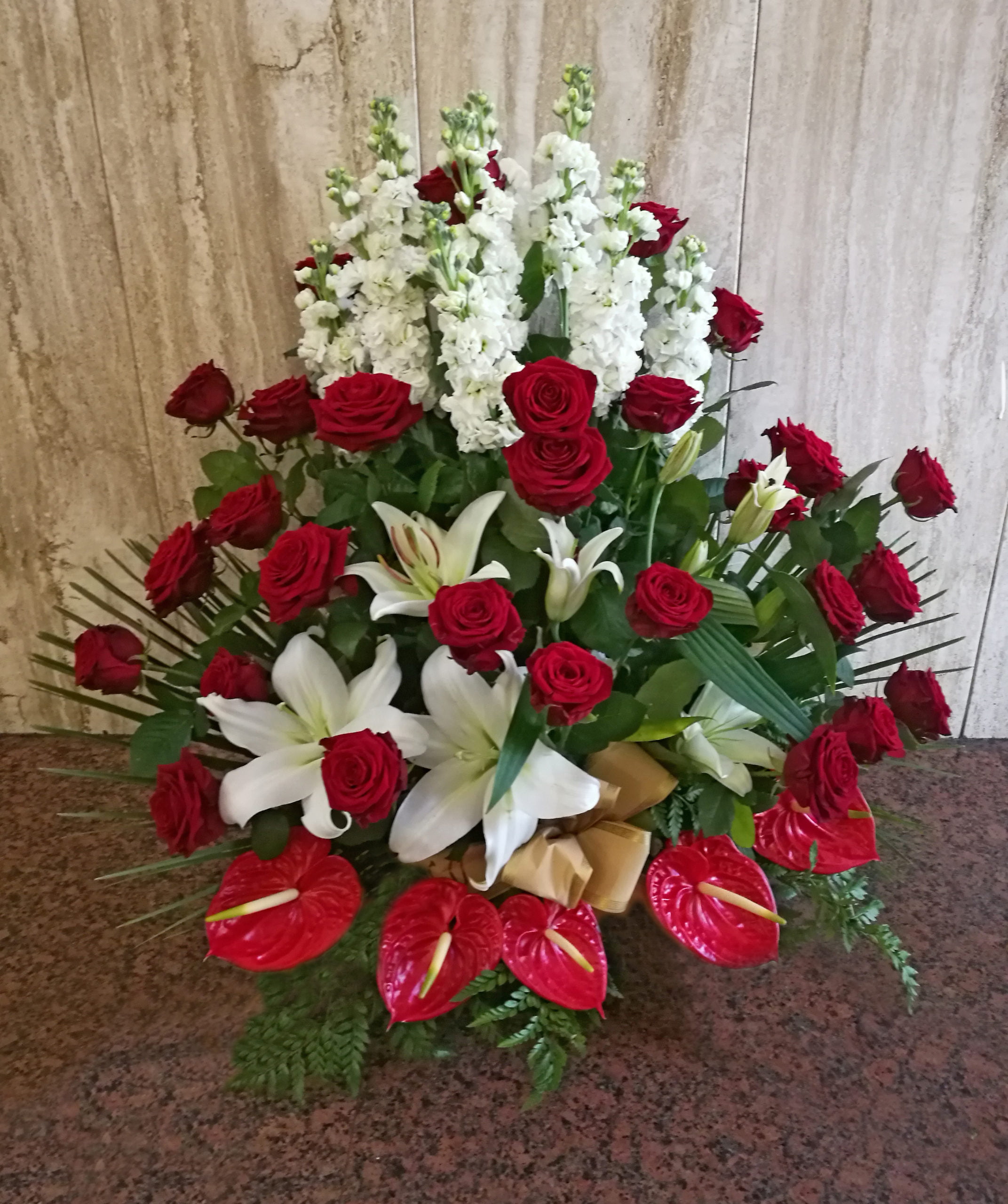 Composizione di fiori freschi recisi misti (rose, gerbere, lilium, lisianthus, anthurium, gypsofila secondo stagione e disponibilità) nelle tonalità del bianco e del rosso.